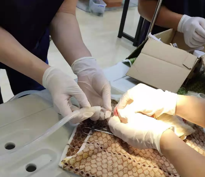 培训中首先学习的是龟类的诊治。一般而言,像乌龟这种带有甲壳的动物,手术的操作时间会有所延长,而且它们的呼吸频率非常低,很难观察和监测,通气风险会大大增加。