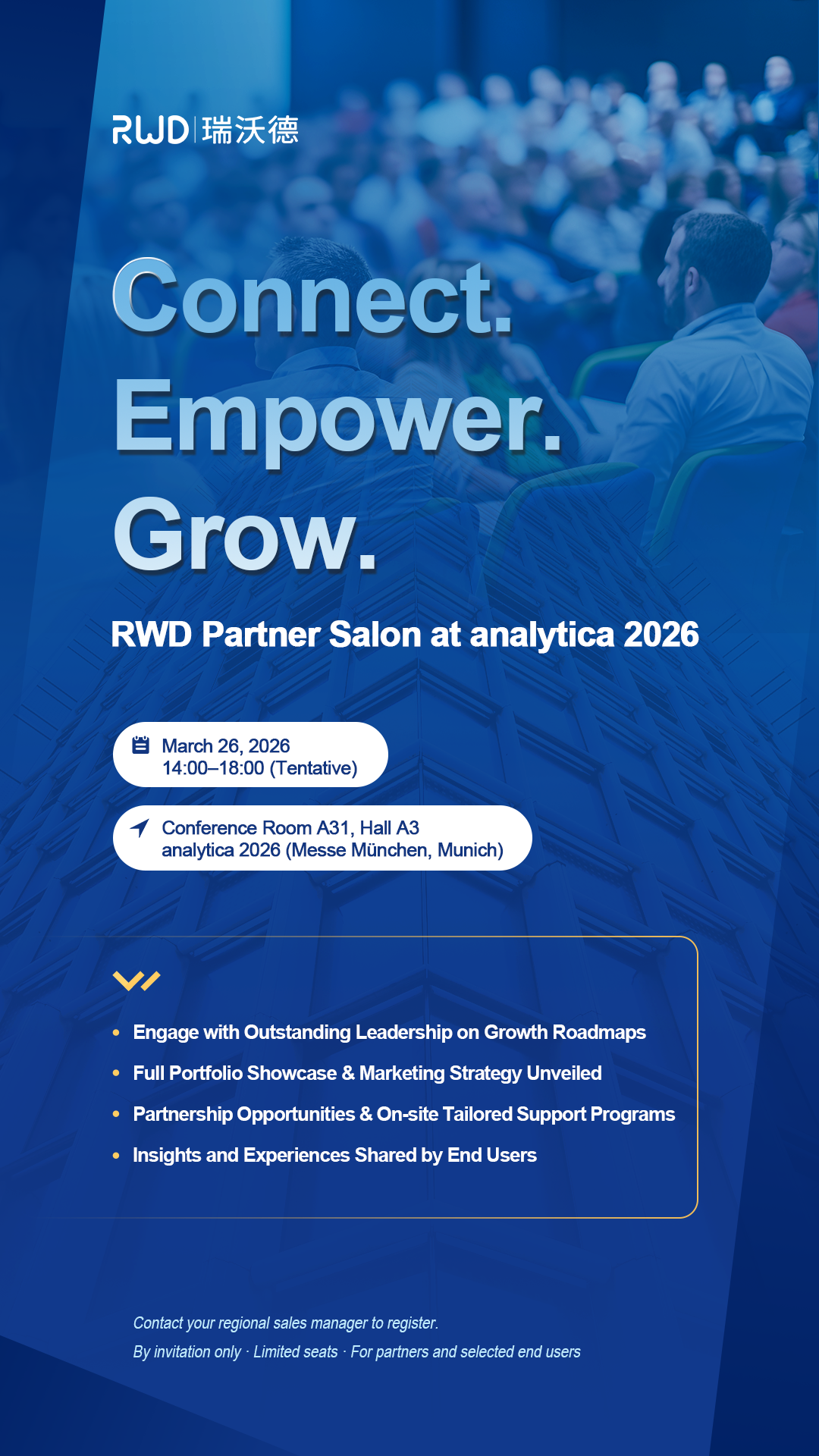 本届 Analytica 期间,瑞沃德还将特别举办一场合作伙伴沙龙(RWD Partner Salon)。沙龙以“Connect. Empower. Grow.”为主题,我们希望通过更近距离的对话,与来自不同市场的合作伙伴深入交流发展经验与合作构想,共同探讨未来增长路径与合作机遇。